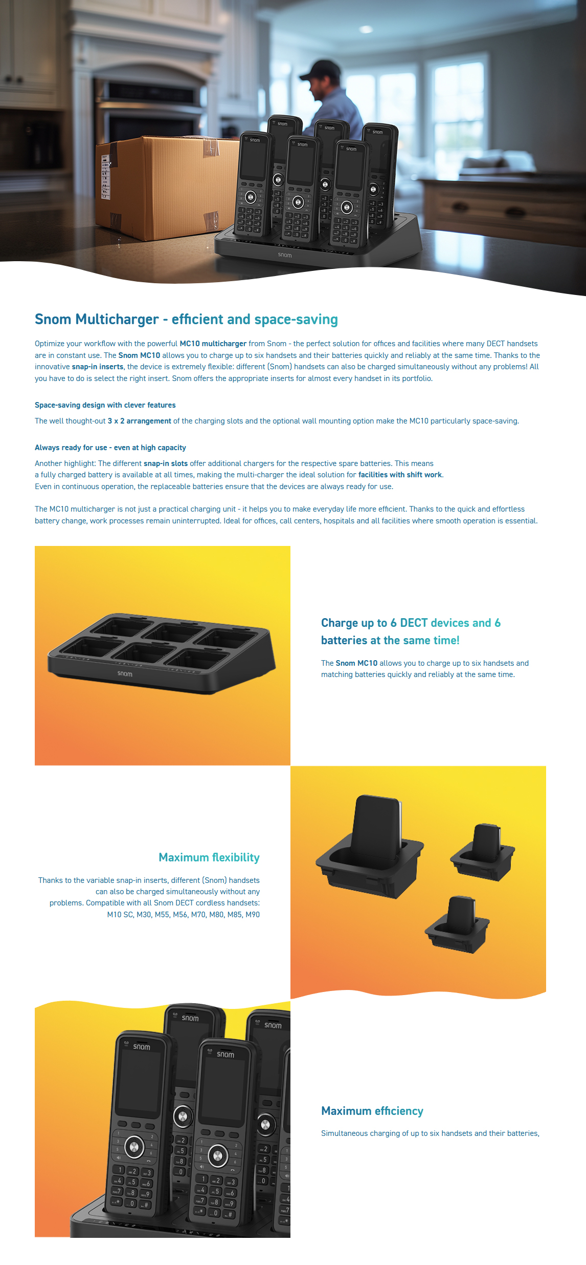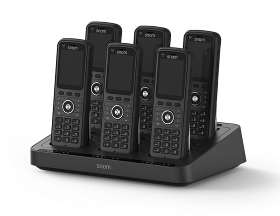 The Snom MC10 allows you to charge up to six handsets and their batteries quickly and reliably at the same time. Thanks to the innovative snap-in inserts, the device is extremely flexible: different (Snom) handsets can also be charged simultaneously without any problems! All you have to do is select the right insert. Snom offers the appropriate inserts for almost every handset in its portfolio.