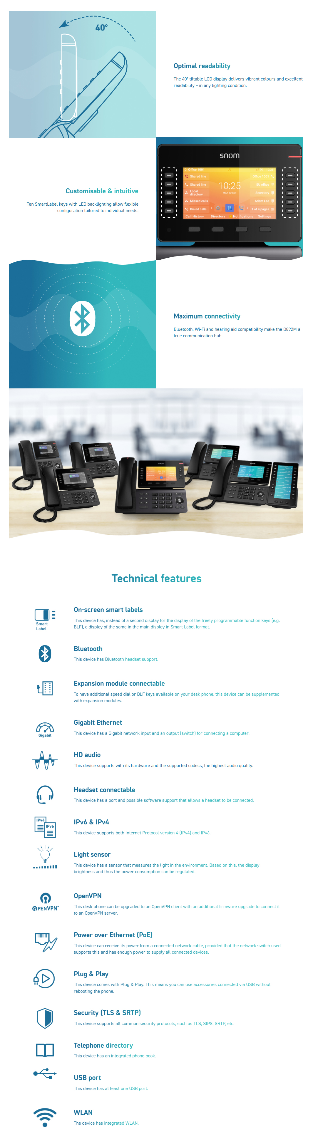 The Snom D892M is a next-generation desk phone that continues the success story of the proven D8xx series. It combines cutting-edge communication technology with thoughtful design and outstanding ergonomics – developed for demanding work environments where reliability and flexibility matter.