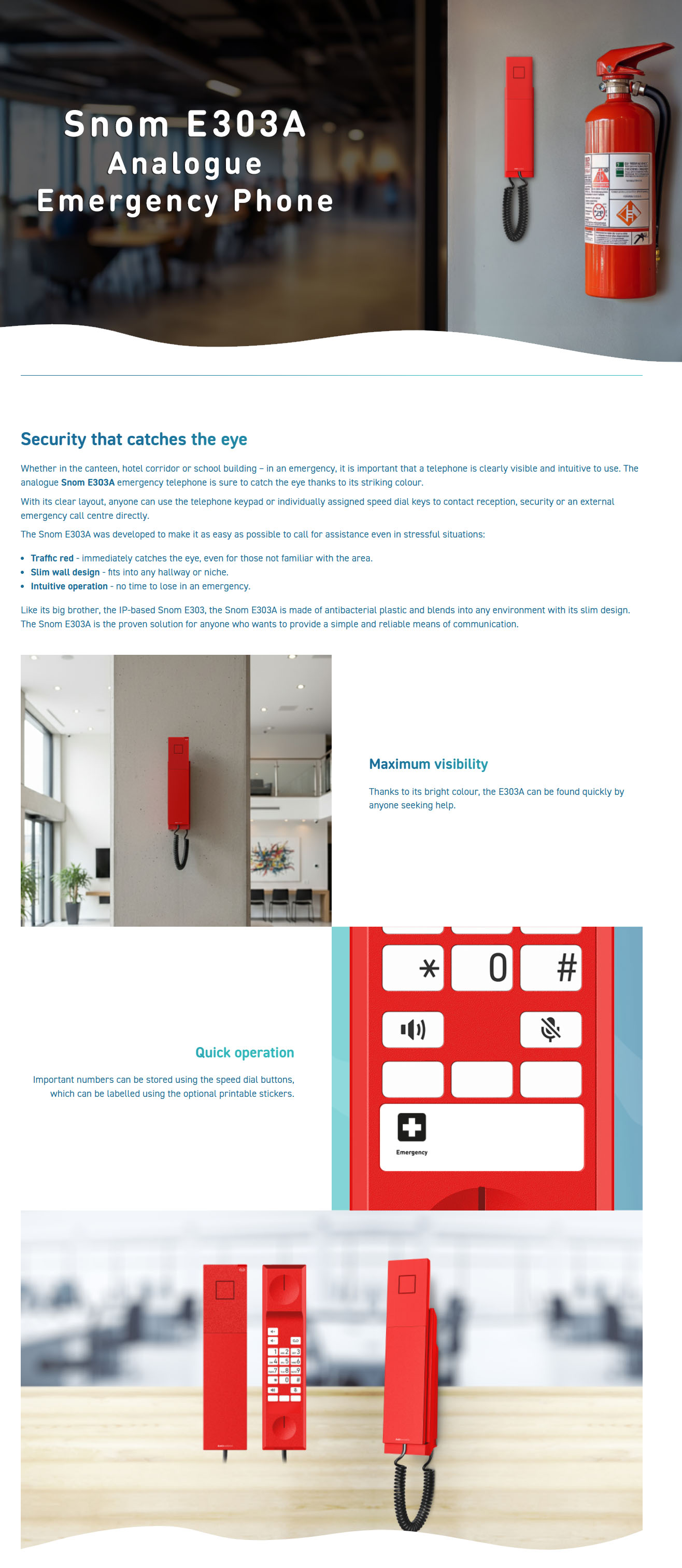 The E303A is a wall-mounted analog telephone for use in offices, hallways, cafeterias, schools, and other public areas. Its striking traffic red design ensures it can be quickly located and emergency calls made even in hectic situations.